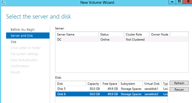 Storage Space oluşturuyorum.Bu işlem için File and Storage Services konsolunu kullanıyorum.