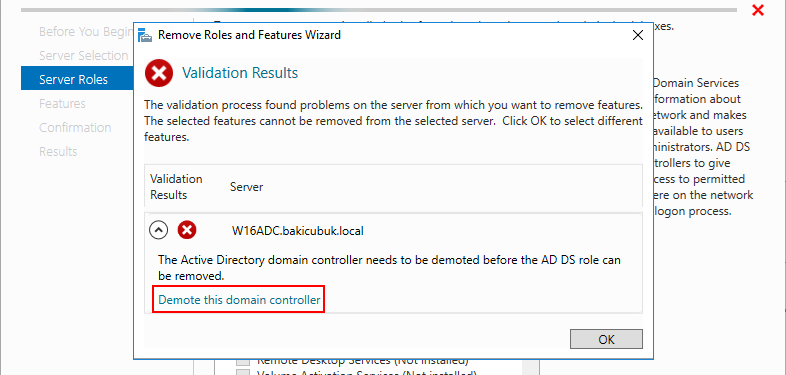 Validation Results ekrani geliyor karşımıza öncelikle olarak sunucumuz üzerindeki Domain Controller yapılandırmasını Demote etmemiz yani Domain Controller yapılandırmasını kaldırmamız gerekiyor. Demote this domain controller sekmesine tıklayarak sunucumuz üzerindeki Domain Controller yapılandırmasını kaldırmayı başlatıyoruz.