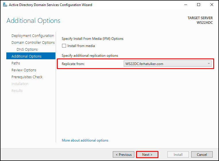 Specify additional replication options : Active Directory Domain Services kurulumunu yaparken ortamdaki hangi Active Directory Domain Services sunucu üzerinden database oluşumu ve diğer yapılandırmanın replikasyon işlemleri yapacağını belirleyeceğimiz bölümdür.