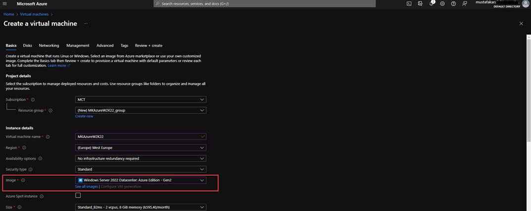 Giriş bölümünde bahsettiğim gibi şu an için Windows Server 2022 Datacenter Azure Edition‘ı Azure IaaS VM oluştururken kullanabilirsiniz bunun için Azure kullananların çok iyi bildiği gibi tek yapmanız gereken Image kısmından bu sürümü bulup seçmeniz.