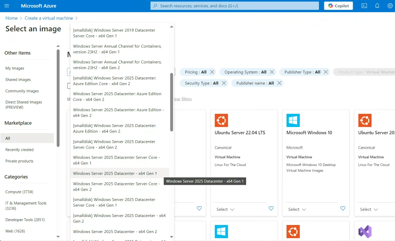 Windows Server 2025 işletim sistemini yukarıda Image kısmında seçili görüyorsunuz fakat Image kısmındaki pencereyi genişlettiğinizde Windows Server 2025 seçeneğini göremeyebilirsiniz. Bu sebep ile alt kısımda bulunan “See all images” seçeneğini seçip aşağıdaki ekrandan Windows Server 2025 üzerine gelip “Select” btunundan kurulum tipini belirleyebilirsiniz.