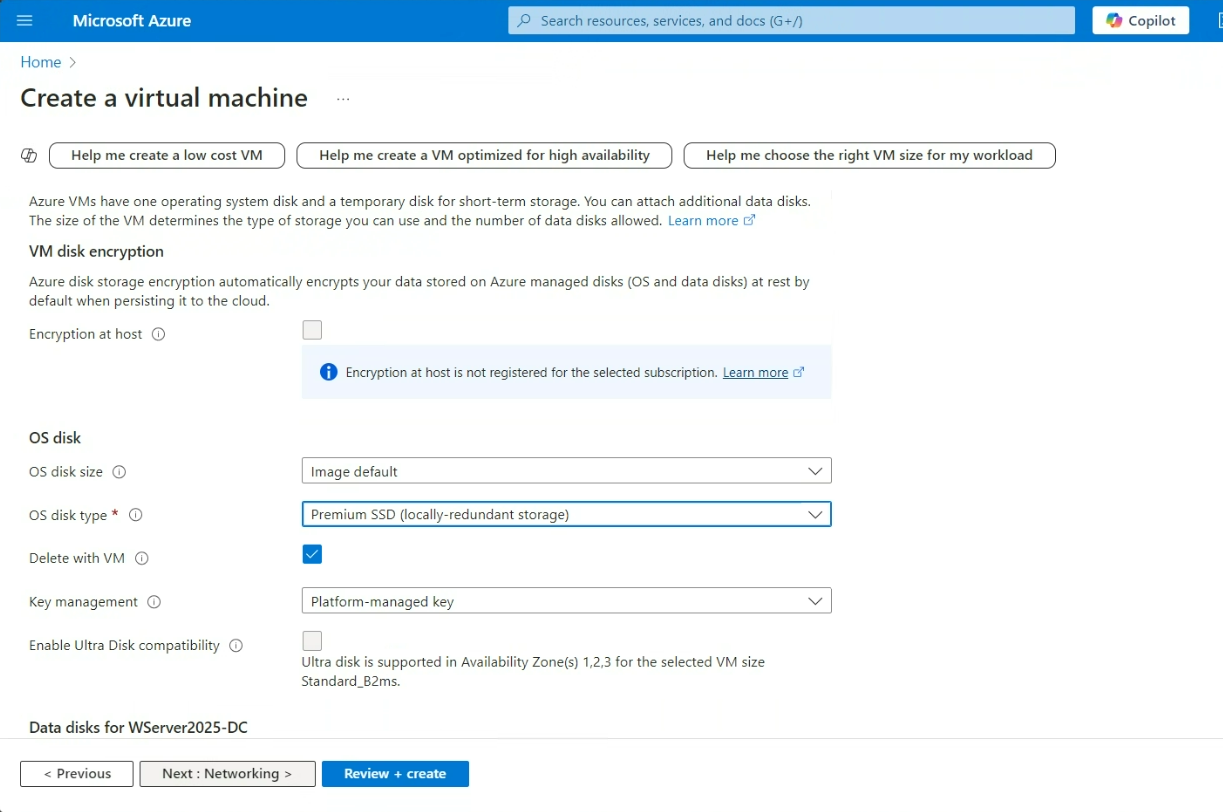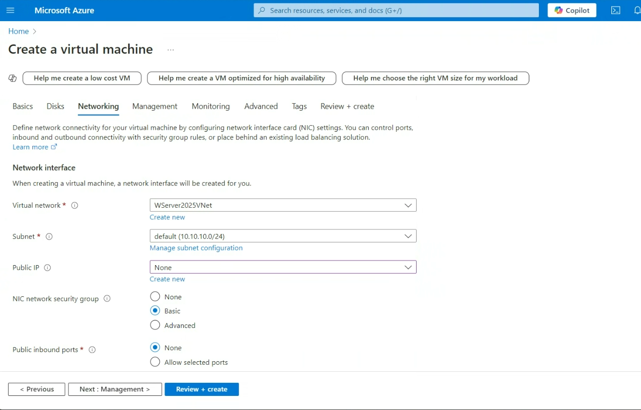 Networking ekranında Windows Server 2025 sanal makinemizin çalışacağı virtual network bilgilerini belirliyoruz. Burada yine sizlerin ihtiyacına bağlı olarak public IP ve diğer seçenekler ile işlemlerinizi yapabilirsiniz.