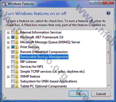 3) Windows Features penceresinde, Removable Storage Management seçeneğini işaretleyin ve OK tuşuna basın.