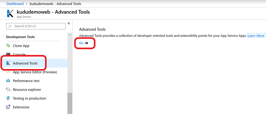 Kudu Dashboard’u, Azure App Service üzerinde çeşitli araçları barındıran bir ara yüz olarak tanımlayabiliriz. Kudu’ya ulaşmak için App Service üzerinden Development Tools altında yer alan Advanced Tools‘u kullanarak (Resim-1) ya da App Service’inize ait url’e scm ekleyerek (Resim-2) ulaşabilirsiniz. Örnek olarak tarayıcıdaki adres çubuğunda <appname>.azurewebsites.net olan adresi <appname>.scm.azurewebsites.net olarak değiştirmeniz yeterli.