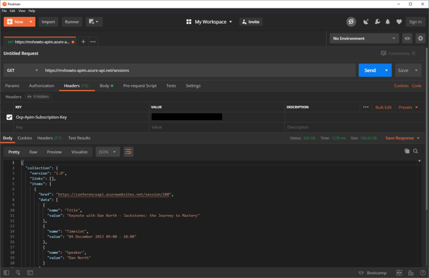 Öncelikle Postman kullanarak APIM ‘e bir request göndermek istiyorum. Resim-1‘de göreceğiniz gibi, request url olarak APIM üzerinde tanımladığım Demo Conference API adresini ve Header’a da Ocp-Apim-Subscription-Key değerini giriyorum. Bu key’e APIM üzerindeki Test ekranından ulaşabilirsiniz. GetSessions metodunu başarıyla çağırdım.