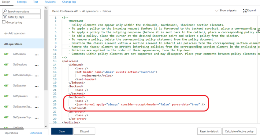 Inbound processing‘e policy’ler eklemiştim. Bu bölümde ise Outbound processing üzerinde neler yapabiliyoruz bakalım. Özellikle web servislerin en büyük sorunlarından biri de response content tip değişimi yani XML’den JSON’a ya da henüz karşılaşmamış olsam da JSON’dan XML’e çevirmektir. Bunun için kod tarafında çok da küçük sayılmayacak değişikliler yapmamız gerekebilir. Azure API Management (APIM) üzerinde ise bu Resim-1‘de göreceğiniz üzere tek satırlık bir XML tag’i eklemem yeterli.